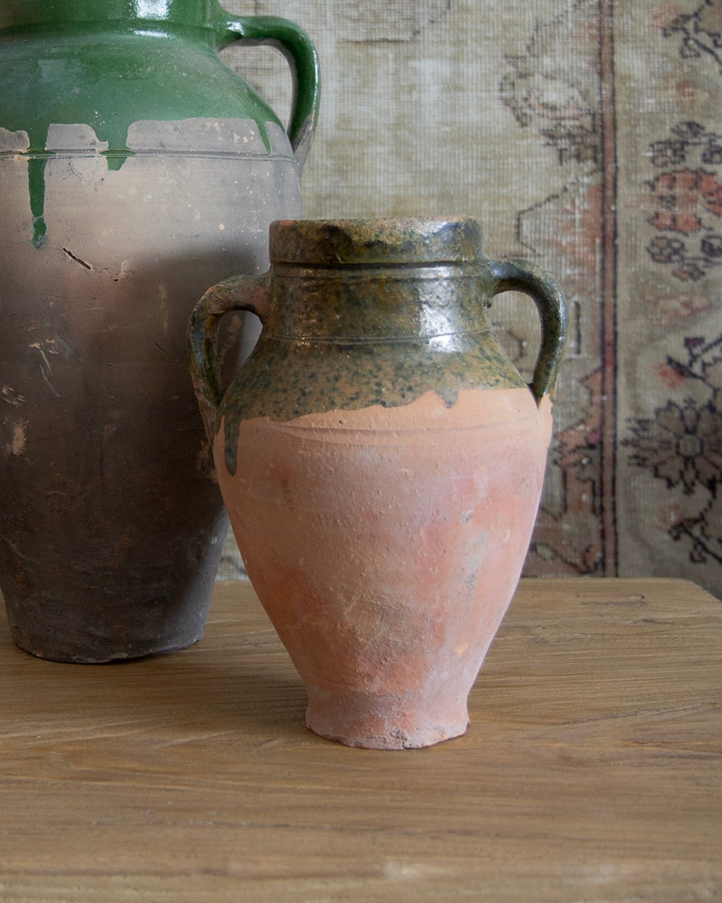An exquisite vintage Turkish Pot with a green glazed finish and handles, steeped in history and tradition. It has weathered the passage of time, gaining a rich patina and an aura of timeworn charm.