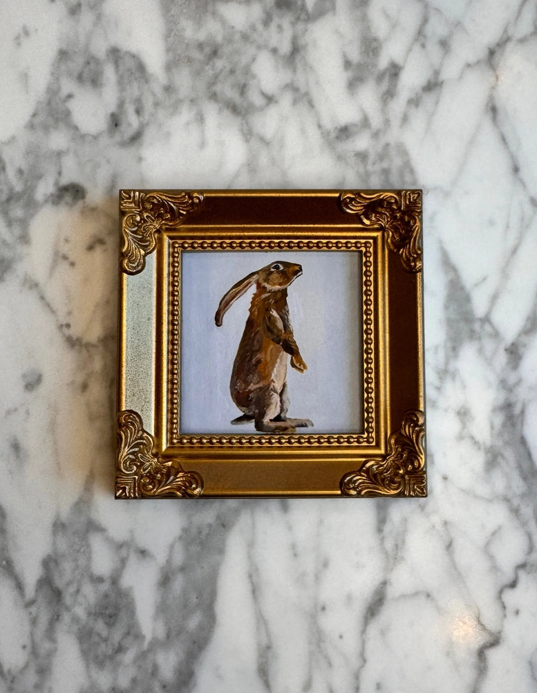 A charming, little rabbit with a soft blue backdrop.