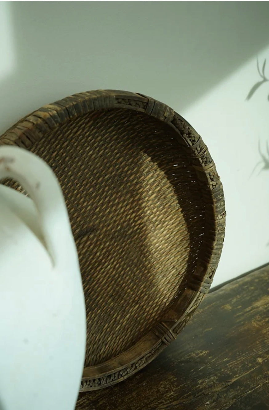 A delightful enhancement to your home decor ensemble. Meticulously crafted from willow and reed, these baskets, once employed as bamboo drying & harvest baskets, now bring a touch of rustic allure to any setting. Adorned with a charming weave pattern, these vintage gems infuse spaces with both texture and warmth. Whether showcased on a coffee table, hung on a wall or utilized to house cherished trinkets, each basket exudes individuality.